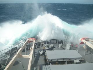 南極観測船しらせは、第47次南極地域観測隊を乗せ、オーストラリア西海岸フリーマントル港を12月3日(土)10:00に南極昭和基地に向けて出航した(写真1、2)。しらせは外洋に出ると、波とうねりを受けて大きく揺れ始めた(写真3:揺れる船の様子)。特に4日(日)~5日(月)にかけての揺れが激しく、立っているのも大変で、船室にロープでくくりつけた荷物も軋んでいた。