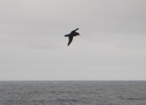 最初に黒く見えた鳥、よく見るとくちばしはやや黄色い。おそらく、ノドジロクロミズナギドリ(写真4)であろう。常時3~4羽は船の周りを飛んでおり、最も多く観察できた。羽を休めるためだろうか、海に着水して水面に浮かんでいるものも見られた。