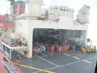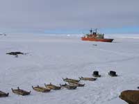観測船しらせは、12月24日にようやく、昭和基地の沖に停泊した(写真8)。定着氷に到達した12月15日から10日目のことであった。