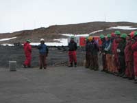 ヘリコプターが「しらせ」から離れると(写真2)あっという間に見えなくなり、窓の外は果てしなく続く白の世界となった(写真3)。20分程度後、昭和基地のヘリポートに到着し、昭和基地にいる第46次越冬隊の出迎えを受けた(写真4)。