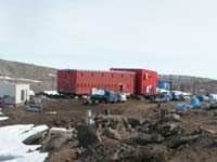 昭和基地は、大陸の東オングル島(写真4)にある。早速一緒に到着した観測隊員とともに、昭和基地を散策した。昭和基地の中心部は、北の浦に面した海沿いにあり、管理棟や居住棟、また気象棟や観測棟などの観測施設がある(写真5)。昭和基地についたばかりの私たち第47次隊は、当分は基地中心部から南にある夏隊宿舎に宿泊する(※註1)(写真6)。