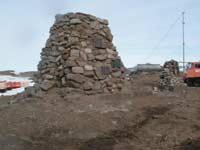 散策の途中、基地中心部の北の浦に面した場所に、ひっそりとたたずむ記念碑を見つけた(写真7)。これは、1960年の第4次南極地域観測隊で、犬(※註2)の餌付けや調査用そりの点検のため、ブリザードの中に建物の外に出て消息を絶った福島隊員を偲ぶもので、通称「福島ケルン」と呼ばれている。この記念碑は、南極地域の環境の保護に関する法律により、歴史的に価値のあるものとして「南極史跡記念物」に指定、保護されている(※註3)。