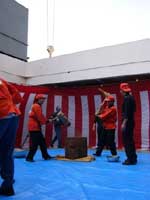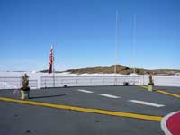 一方、船の中では、年末にかけてしらせの乗員による餅つきが行われ(写真2)、船内の食堂や隊員公室など各所に、鏡餅が飾られていた(写真3)。ヘリコプターの発着する飛行甲板には、門松が飾られ(写真4)、1月1日の朝には、ここで観測隊と乗組員全員で、記念撮影が行われた。その後、食堂で鏡開きが行われ、獅子舞も登場した(写真5)。観測隊員にもひとりずつおせち料理が配られた。南極に来て図らずも、日本列島の典型的な正月を体験することになり、なぜか安心した。