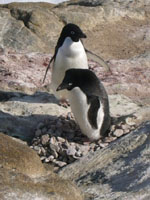 ペンギンの巣には、小石が敷き詰められている(写真3)。この巣にはおそらくつがいらしい2羽のペンギンがいた。この小石の上で卵を温め、ヒナをかえすのである。しばらく観察していると、近くから、小石を拾って巣に運んでいた(写真4)。おそらく、巣の補修をしているであろう。