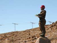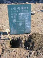 物資・廃棄物の集積場として利用されていた跡地、海岸添いなど、基地での活動が周辺に与える影響を把握できると予想される地点で、土壌を採取した。プラスチック製のスコップで、1つの場所について5点丁寧に採取し、それぞれの状況を写真にとる(写真1)。昭和基地の地面は主に片麻岩という岩石に覆われているが、実際には、こうしたものが風化した細かい砂や泥状となっており、容易に採取できた。