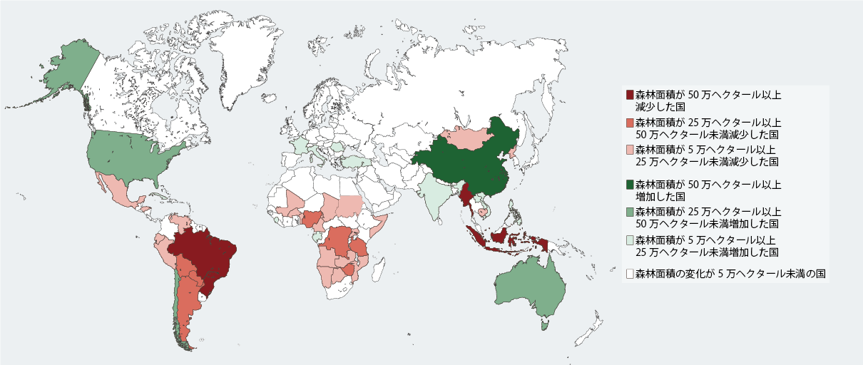 特に、南アメリカ、アフリカなどの熱帯の森林を中心に減少面積が大きくなっています。一方、アジア、ヨーロッパを中心として森林面積が増加している国も見られます。森林面積の増加と減少には、地域的な偏りが見られます。