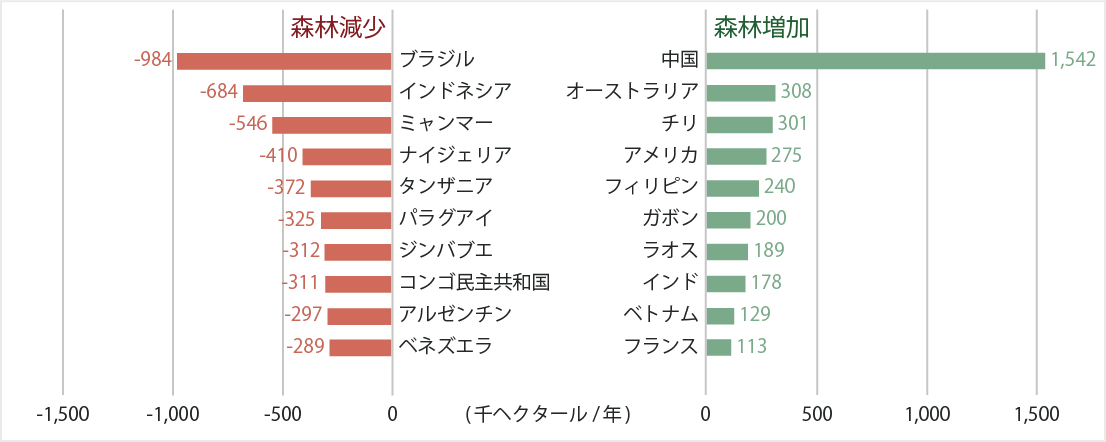 国別にみると、2010年から2015年までの間に森林の減少が大きかったのは、ブラジル、インドネシア、ミャンマーなどです。一方、活発な植林活動を行っている温帯地域の中国やフィリピン、インドなどの国では森林面積が増加しています。