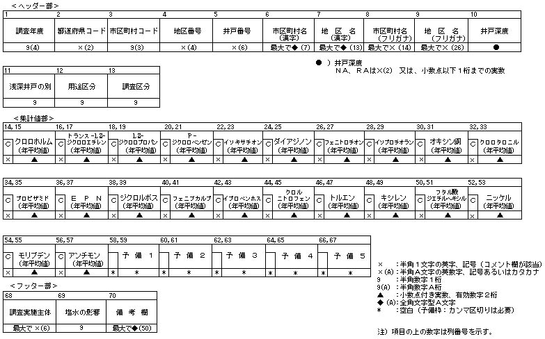 1井戸の測定結果集計値は1レコードで構成される。ただし、同一井戸で2以上の調査区分で測定を実施している場合は、調査区分数のレコードとなる。