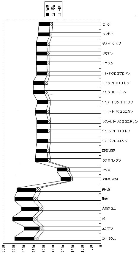 健康項目B:ジクロロメタン、四塩化炭素、1,2―クロロエタン、1,1―ジクロロエチレン、シス―1,2―ジクロロエチレン、1,1,1―トリクロロエタン、1,1,2―トリクロロエタン、トリクロロエチレン、テトラクロロエチレン、1,3―ジクロロプロペン、チウラム、シマジン、チオベンカルブ、ベンゼン、セレン