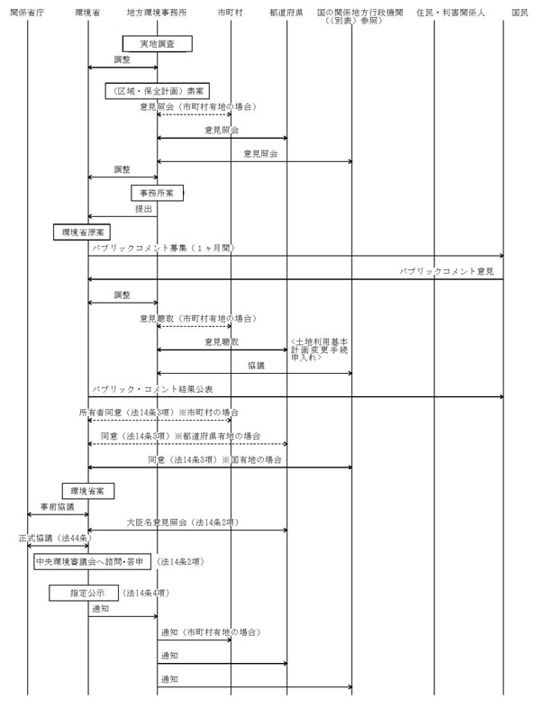 3 本省は事務所案を環境省原案として、パブリックコメントを行う。パブリックコメントに寄せられた意見は、地方環境事務所と調整しつつ原案への反映を検討し、必要に応じて地方環境事務所から市町村(指定しようとする土地を所有する市町村に限る)、都道府県及び国の関係地方行政機関に対し意見照会を行う。また、この頃都道府県に「土地利用基本計画」の変更手続について申し入れる。