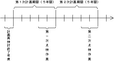 計画再検討の終了した年度(官報告示日の属する年度)の翌年度から五年間を第一次計画期間とし、当該計画期間の四年目から五年目にかけて、第二次計画期間(五年間)を前提とした点検を実施することとし、以後順次同様の考え方で五年ごとに点検を実施していくこととする。