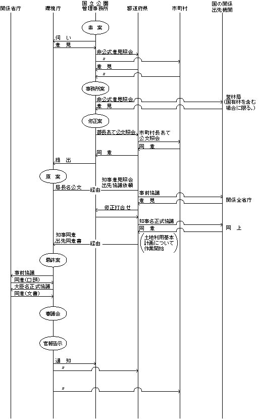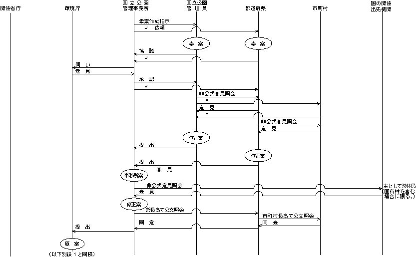 (三) 素案を含め、作業途上における各段階の案については内容に応じて「国立公園の指定書及び公園計画書作成要領」(昭和五四年四月一日付け環自計第二五〇号当職通知)の様式第一―三及び様式第二―三並びに「国立公園の区域図及び公園計画図等作成要領」(昭和五四年四月一日付け環自計第二五〇号当職通知)の「区域変更図」、「保護規制計画変更図」及び「変更施設図」により、関係図書を作成するものとする。