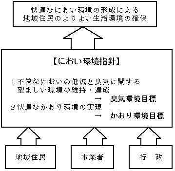 におい環境指針は、地域住民のよりよい生活環境の確保を図るため、「臭気環境目標」と「かおり環境目標」を設定し、これらの目標の達成を図るため、国、地方公共団体、事業者及び国民が各々担うべき役割を提示しており、これにより地域の快適なにおい環境を形成するための施策を進めていくことを目的としている。