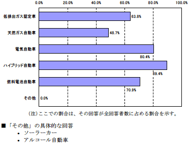 「ハイブリッド自動車」が最も多く、次いで「電気自動車」が多かった。「燃料電池自動車」との回答は3番目に多く、約7割の方が認識していた。最も少なかったのは、「天然ガス自動車」だったが、回答率は5割弱だった。