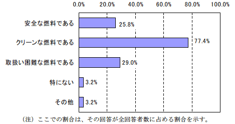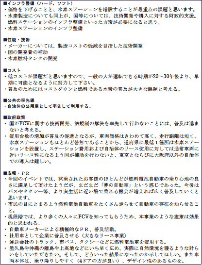 「燃料は水素」が最も多く、次いで「高価格」、「静かな走行音」、「水蒸気のみの排ガス」、「少ない燃料ステーション」の順に多かった。一方、「寒冷地の利用困難」、「改質器によるメタノール燃料など」、「日本で世界初の実用化」、「高いエネルギー効率」については認識度が2割未満に留まっていた。