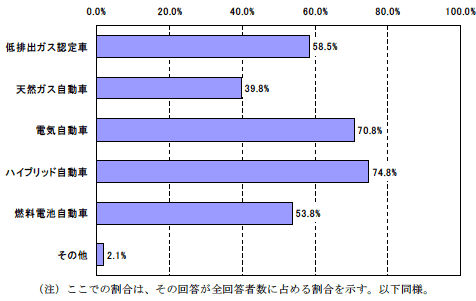 「低排出ガス車認定制度」との回答が最も多く6割以上で、次いで「グリーン税制」の順に回答が多かった。