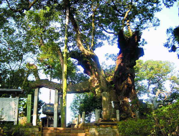 樹齢1300年から1500年のタブノキが境内をおおい、枝が地上に垂れて根を張り子楠となり、別の木のように見える。境内はダブノキ特有のかおりがする。国指定天然記念物で、樹高20メートル、幹回り27.5メートルにもなる。地元住民が中心となり、「おおくすを守る会」を発足し、自然保護活動を展開している。