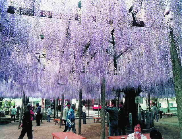 西暦960年に植えられたとされる千年藤は神社の境内をほぼ覆いつくすかたちで四方に枝を伸しており、周囲2.8メートルの根から生えた枝は四方に伸び、枝張りの面積は420平方メートルにも及び、狭い境内をすっぽり覆うほどである。花期には周囲に甘い香りを漂わせ、5月の上旬には藤まつりも開かれる。また、地元住民が千年藤保存会を組織し、千年藤保存基金、観光客からの募金、町観光協会補助金等をもって運営にあたっている。