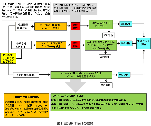 EPAは2009年に農薬を中心とした第1次リストを対象にTier 1(第一段階)試験命令の発出を開始し、受領した試験データの審査に着手した。現在、新たな試験命令に向けて飲料水汚染物質も含めた第2次リストをまとめているところである。こうした中でEPAは、EDSP21という新たなイニシャティブを開始した。これは、内分泌かく乱作用試験の対象となる化学物質の優先順位設定を助けるハイスループット・スクリーニング(HTS)ツールを開発して改良を加え、最終的には優先順位設定にとどまらず、Tier1スクリーニングでの使用に向けて確固たる信頼性を築くことを意図している。