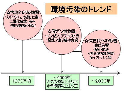 いわゆる有害物質の環境汚染問題を考える時、私達はあるトレンドの中にあることに気づく。(図1) 工業化が急速に進み、公害病が顕在化した 1960 年代から 1970 年代にかけては、"公害病"を中心とした対策が進められた。(第 1 期) これらは応急的な対応という側面を持っており、それが一段落した時に、潜在的な悪影響に目が向けられ始めた。主要なターゲットは環境発ガン物質である。(第 2 期) 研究面では、発ガンのメカニズムの解明やリスク評価手法の開発が進み、 1990 年代に、それらを受けて化学物質の規制が進み始めた。大気汚染防止法、水質汚濁防止法のみならず、飲水の安全性、食品の安全性、労働者の安全性に向けて、 "見えざる発ガンリスク"の低減への努力がなされている。そして今私達は第 3 の期に立っている。"見えざるリスク"の課題として、胎児や乳幼児へのリスクをどう扱うかというステージである。