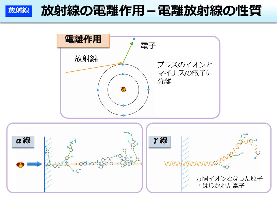 放射線が物質中を通過する場合、持っているエネルギーにより、物質を構成している原子が持つ軌道電子をはじき出して、陽電荷を帯びた状態の原子(又は陽イオンの分子)と自由な電子とに分離します。これを電離作用といいます。