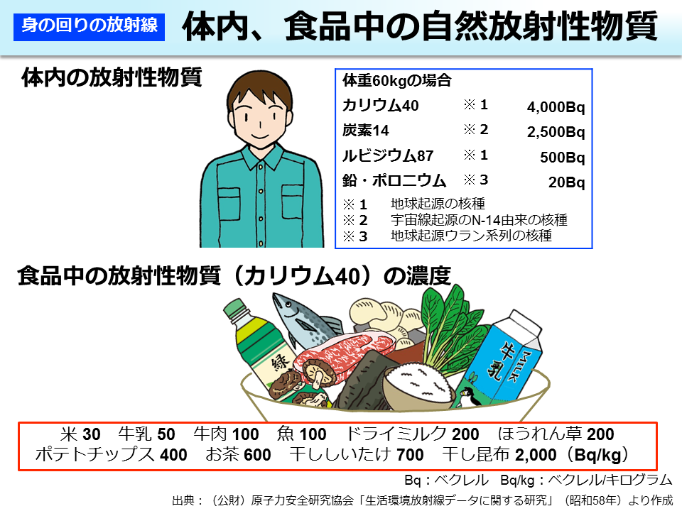 カリウムは生物に必要な元素であり、ほとんどの食品に含まれています。カリウムの0.01%は放射性カリウムであるため、ほとんどの食品には放射性カリウムが含まれています。放射性カリウムはβ(ベータ)線とγ(ガンマ)線を放出するため、食品を摂取することで内部被ばくをすることになります(上巻P74、「目で見る放射線」)。 体内のカリウム濃度は一定になるように保たれているため、食品のカリウムからの被ばく量は体格によって決まり、食生活による影響は受けないと考えられています(