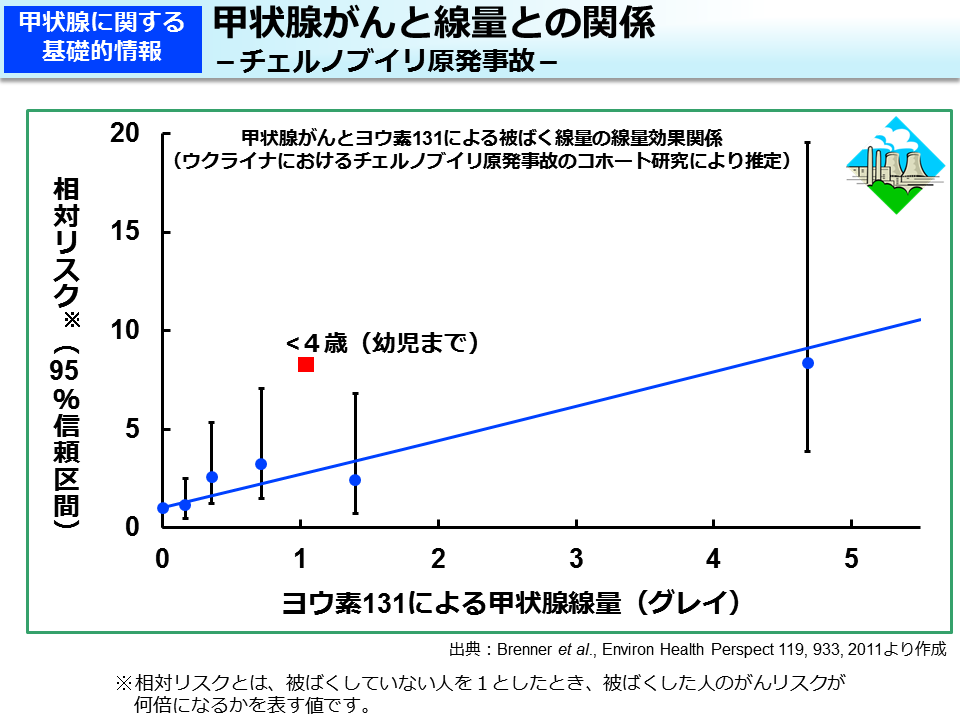 それは、甲状腺が1グレイの放射線を受けると、甲状腺がんになる可能性が2倍になるというものです。この研究では、この2倍という数値は18歳までの子供たちの平均であり、幼児(<4歳)の場合には、これよりも高くなる(図の■)とされています。