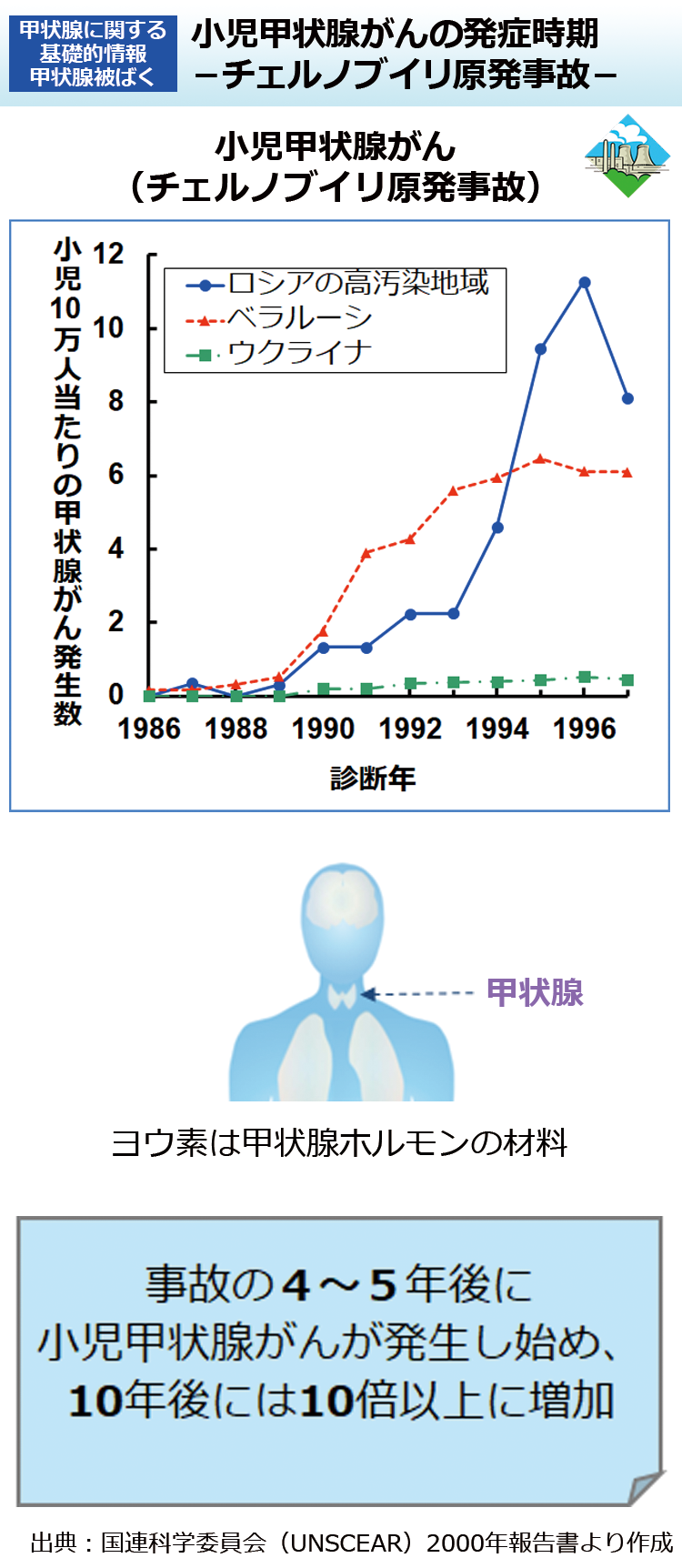 ベラルーシやウクライナでは、事故後4~5年ごろから小児甲状腺がんが発生し始め、 15才未満の甲状腺がん罹患率は、1986~1990年の5年間に比べ、1991~1994年は5~10倍に増加しました。