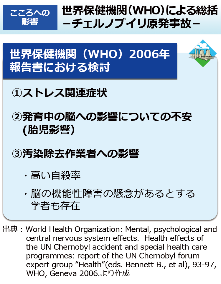 原子力災害で、ストレスによりどのような精神医学的影響が見られたのか、世界保健機関(WHO)報告書のまとめでは4つに要約しています。