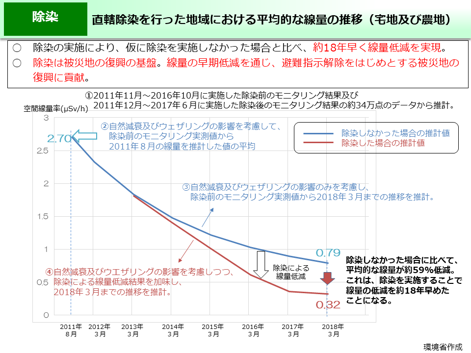 2011年8月を基準として、自然減衰及びウェザリング(風雨等の自然要因)の影響のみを考慮して推計した空間線量率をグラフの青線で示しております。また、除染の効果も含めて推計した空間線量率をグラフの赤線で示しております。2018年3月で両方の空間線量率を比較すると、除染によって平均的な空間線量率が約59%低減していることが分かります。これは、除染の実施により、線量の低減を約18年早めたことになります。