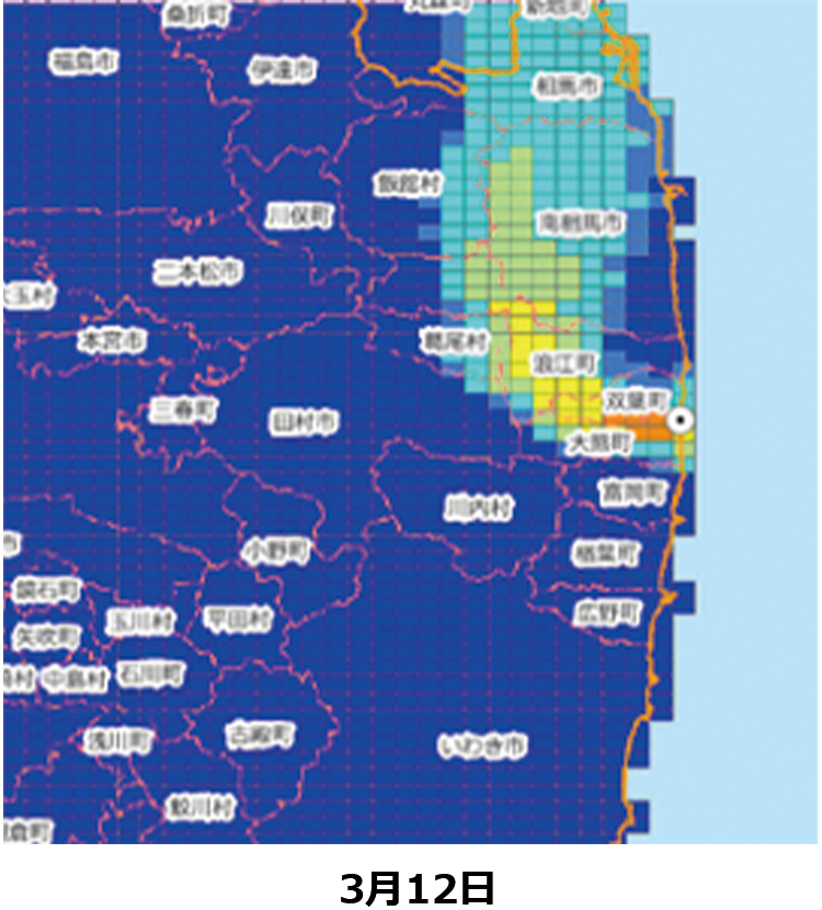 1. 文部科学省(当時)が公表しているモニタリングデータが利用できない2011年3月12日から15日のうち、3月12日から14日までの3日間は、2011年6月に原子力安全・保安院(当時)が公表した放射性物質の放出量データを用いて、緊急時迅速放射能影響予測ネットワークシステム(SPEEDI)により計算された結果を適用しました。3月15日については、3月16日のデータと同じとし、3月16日以降については、文部科学省(当時)が公表しているモニタリングデータを利用しました。