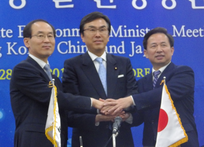 左から尹長官(韓)・石原大臣(日)・李副大臣(中)