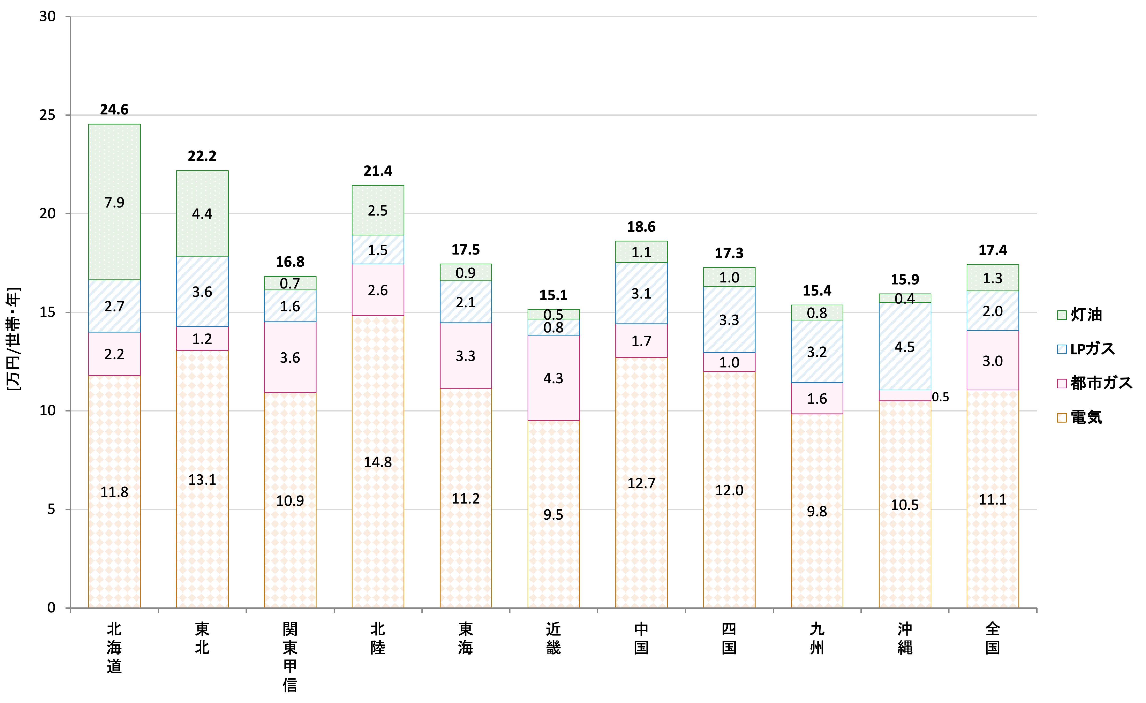 1世帯が1年間に支払った電気・ガス・灯油の合計金額は全国平均で17.4万円となっており、電気が11.1万円、都市ガスが3.0万円、LPガスが2.0万円、灯油が1.3万円となっています。