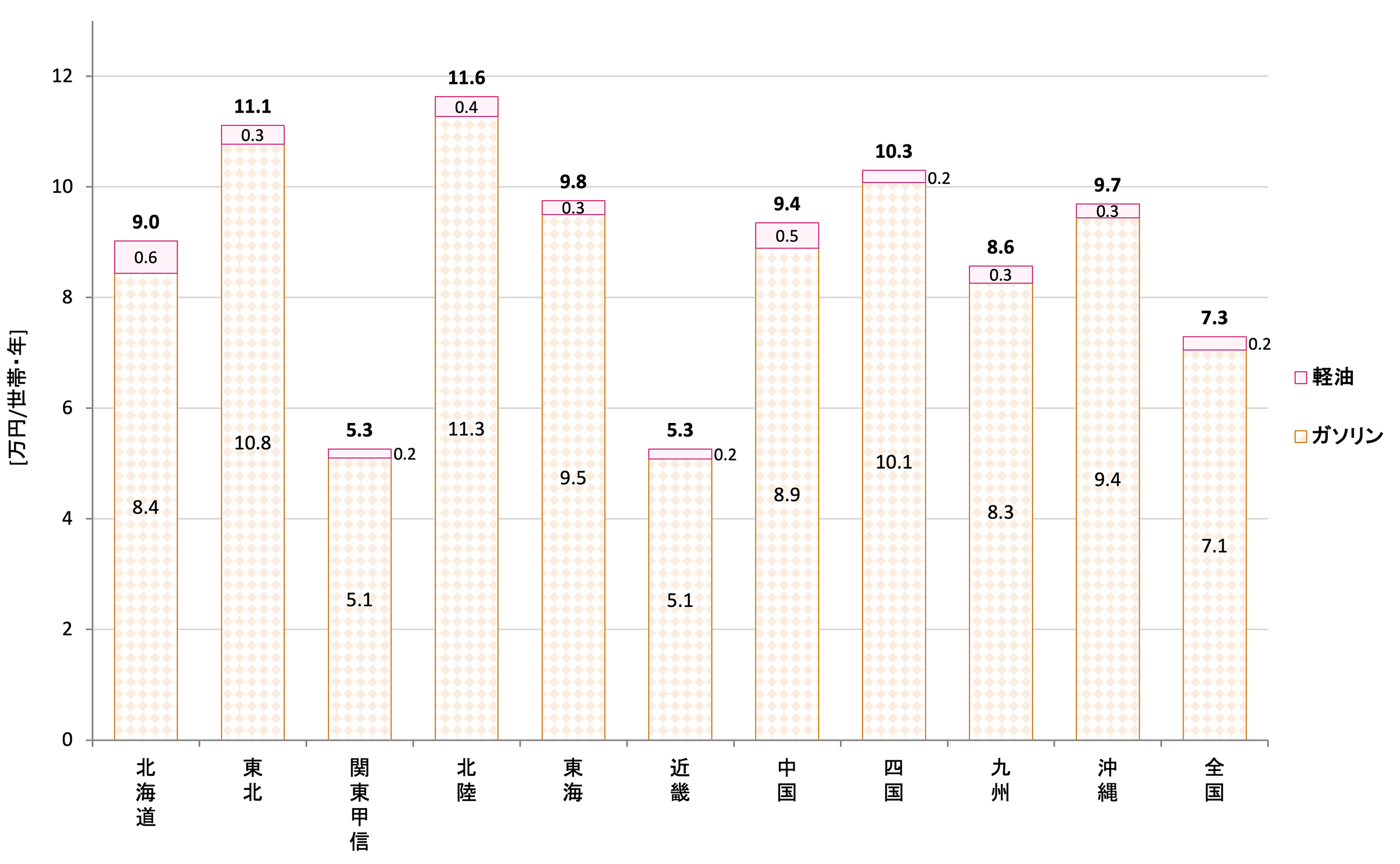 1世帯が自動車用燃料(ガソリン・軽油)の購入で1年間に支払った金額は全国平均で7.3万円となっています。地方別にみると北陸が11.6万円で最も多く、関東甲信と近畿が5.3万円で最も少なくなっています。