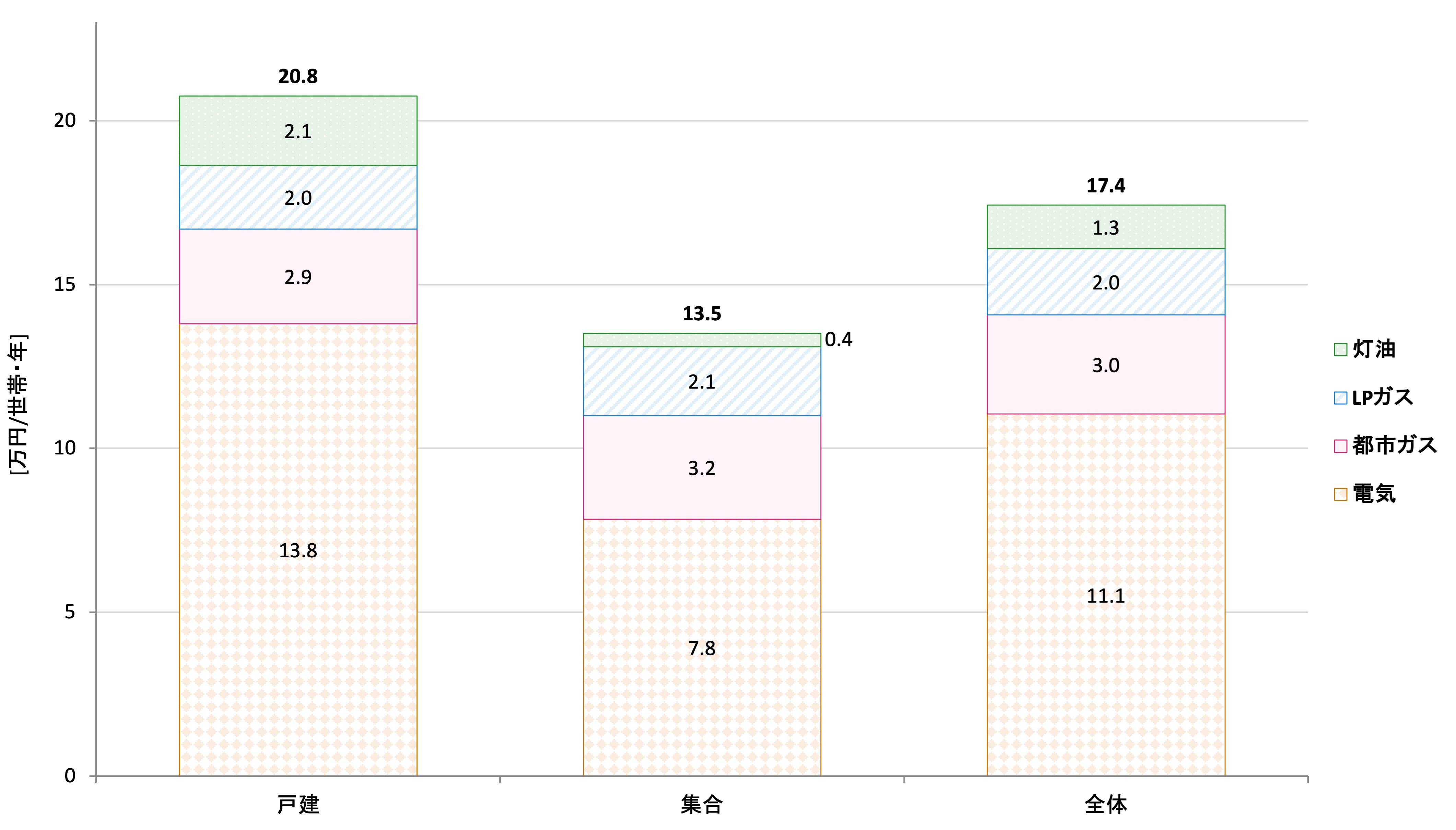 住宅の建て方別に見てみると、集合住宅に住む世帯の支払金額は全国平均で13.5万円となっており、戸建住宅に住む世帯(20.8万円)の6割強の水準となっています。特に電気と灯油の支払金額に大きな差があります。