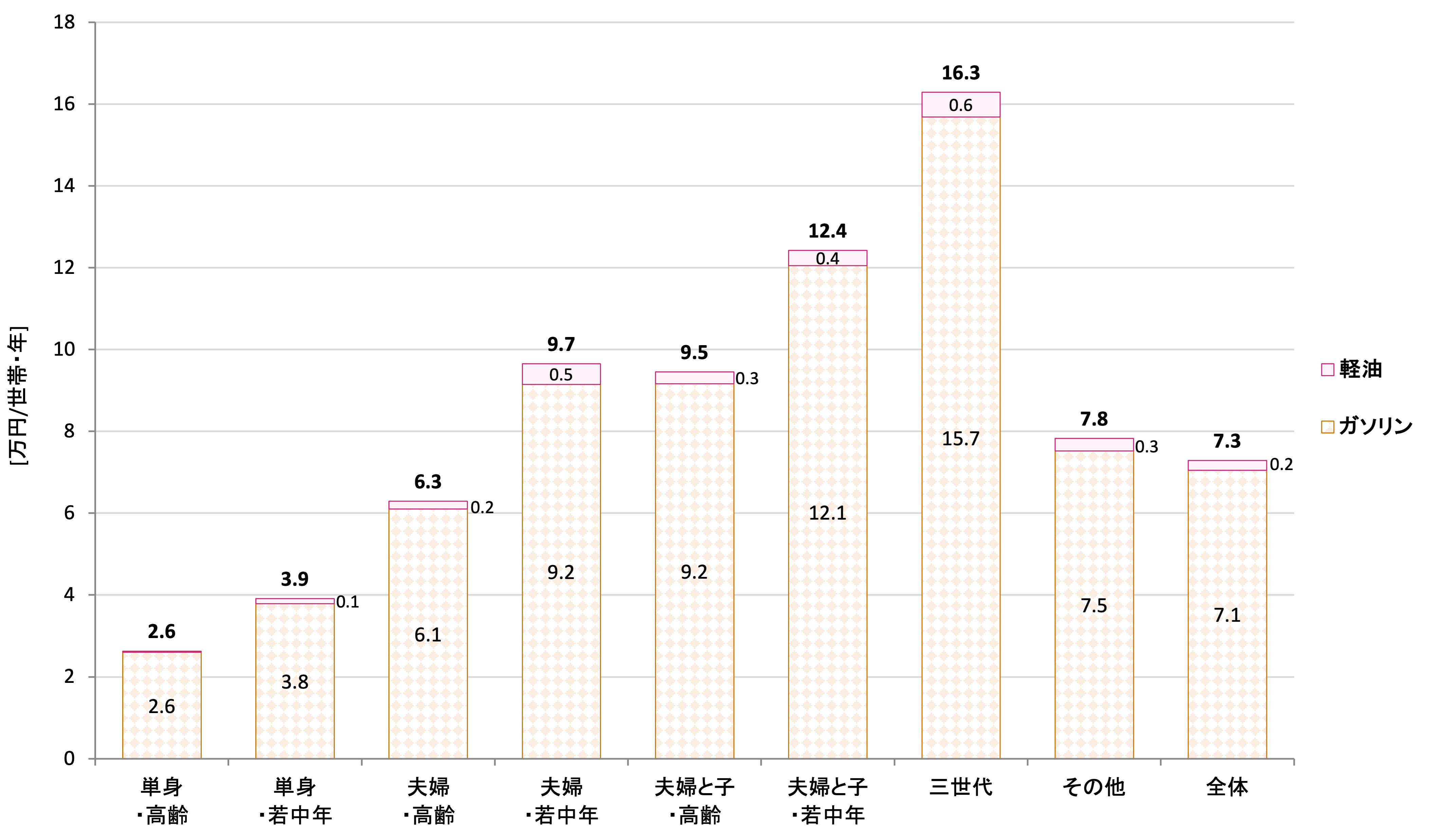 世帯の類型別に見てみると、単身世帯における自動車用燃料の支払金額は高齢世帯で2.6万円、若中年世帯で3.9万円となっており、夫婦と子世帯の約3割の水準(高齢世帯で9.5万円、若中年世帯で12.4万円)となっています。また、高齢世帯よりも若中年世帯の方が支払金額が高くなっています。