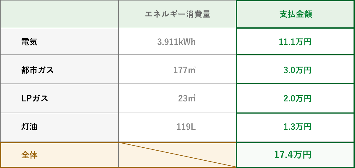 | 電気 | 都市ガス | LPガス | 灯油 | 合計 | |