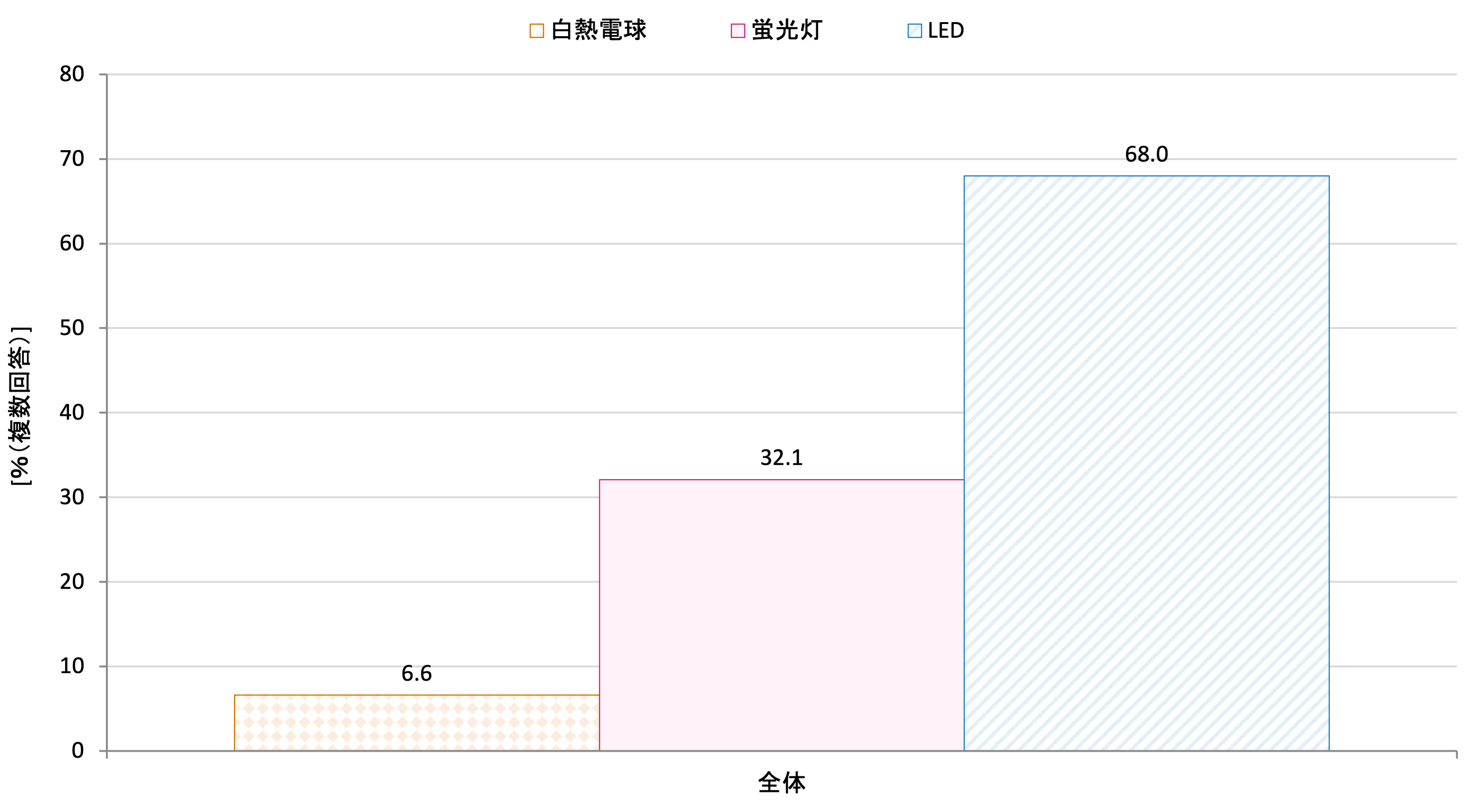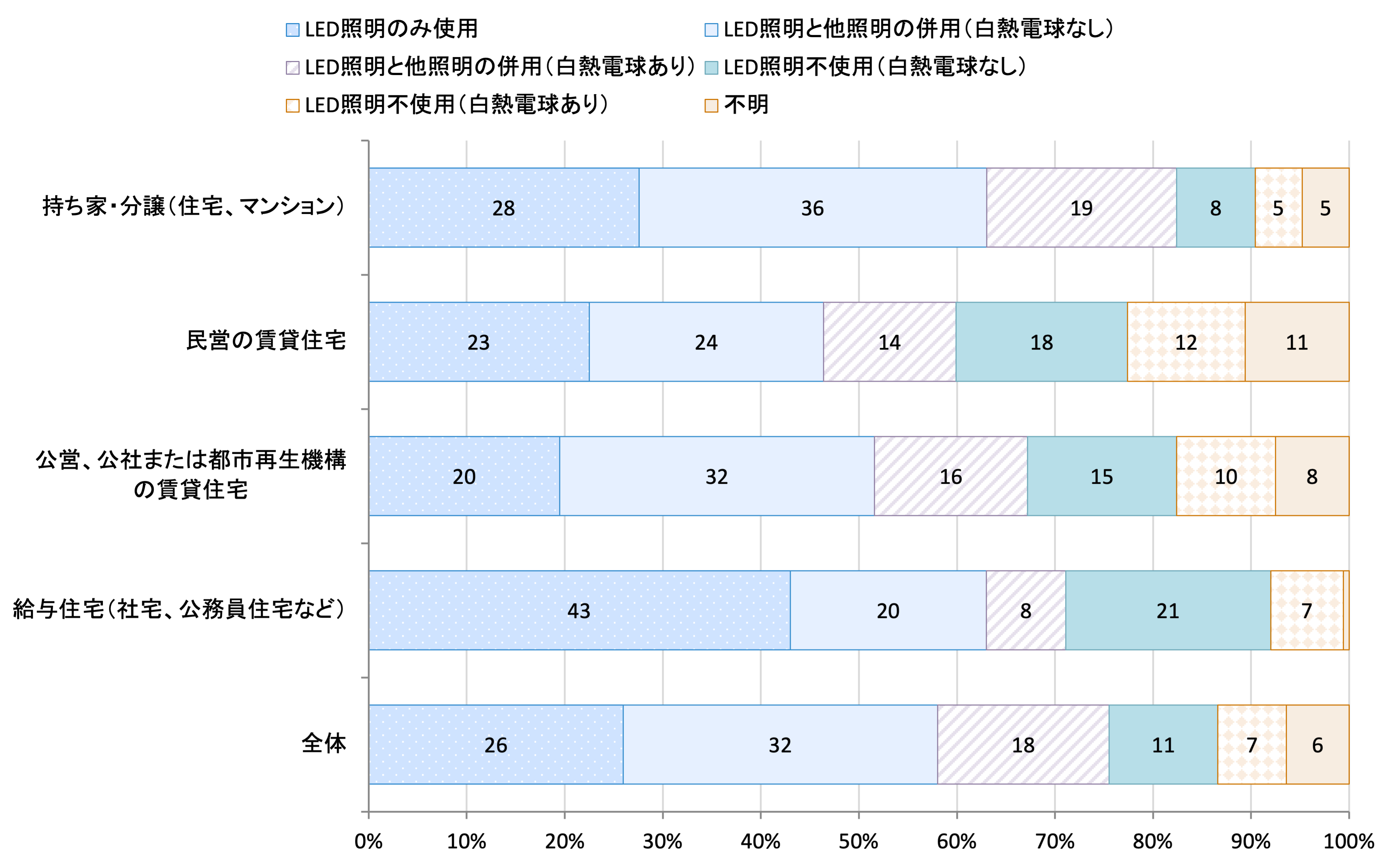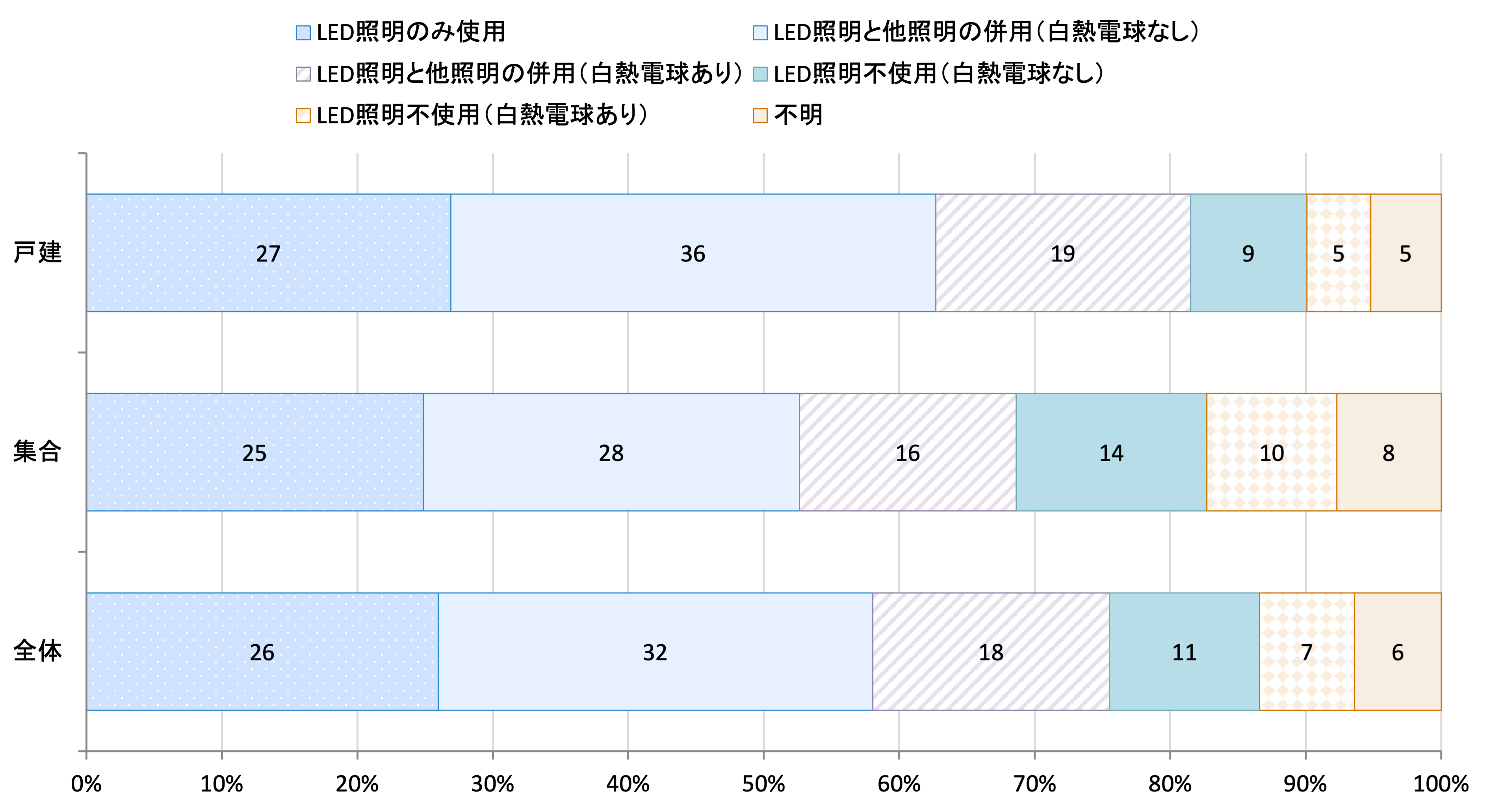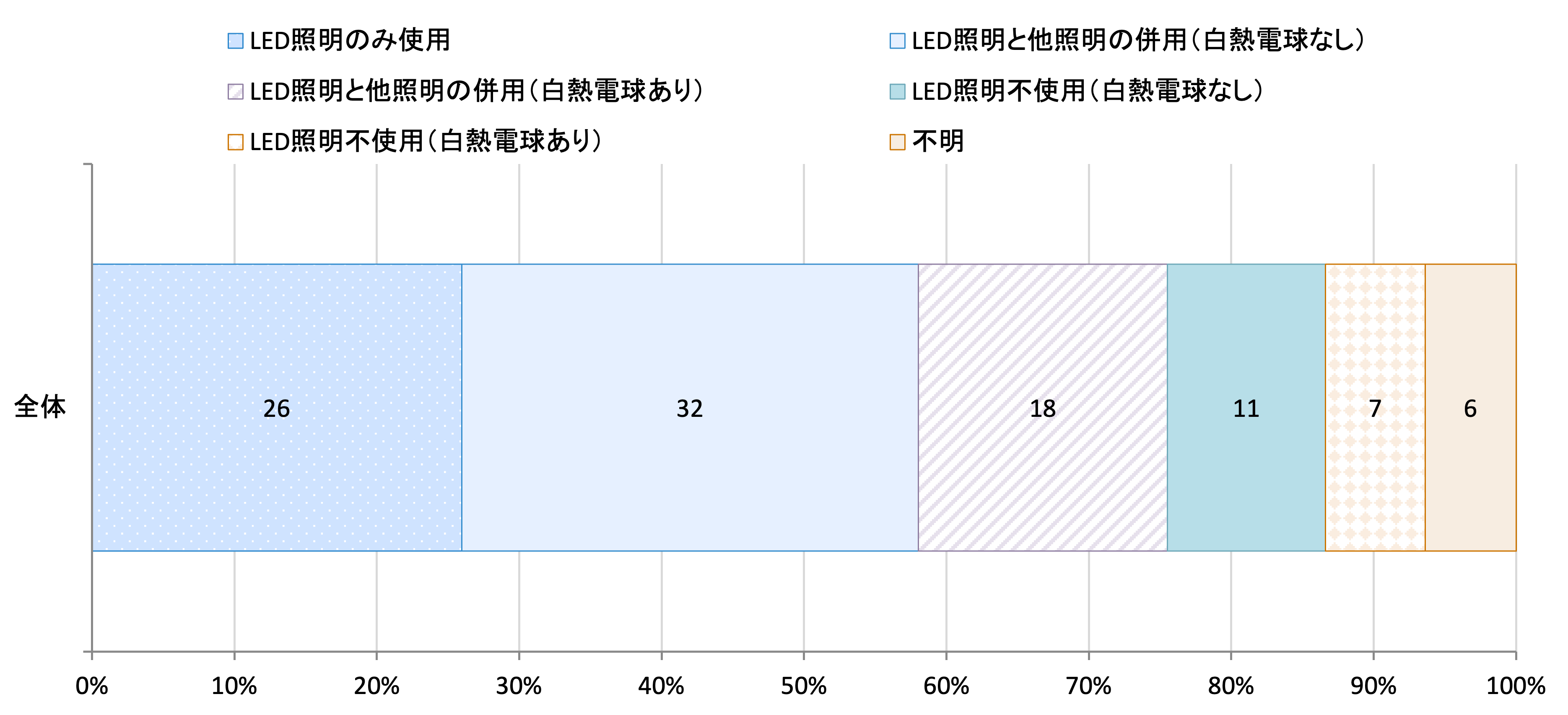 | LED照明のみ使用 | LED照明と他照明の併用(白熱電球なし) | LED照明と他照明の併用(白熱電球あり) | LED照明不使用(白熱電球なし) | LED照明不使用(白熱電球あり) | 不明 | |
