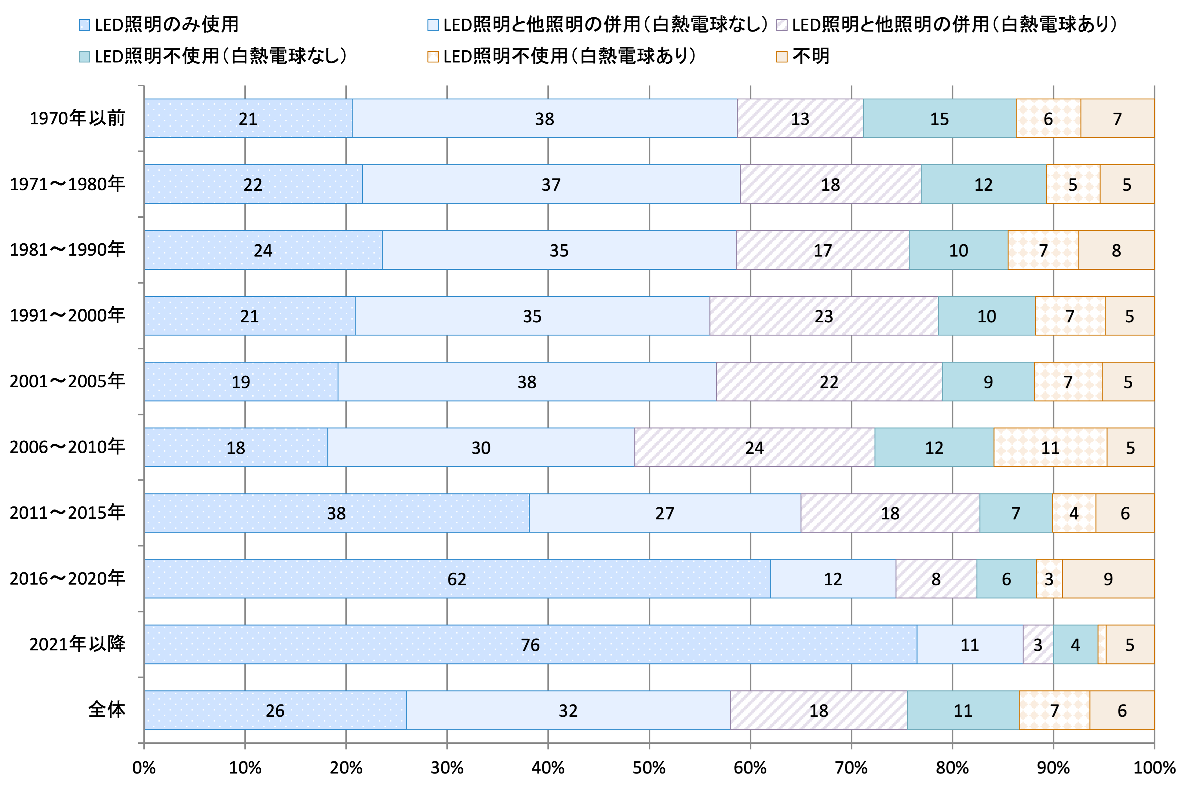 住宅が建てられた時期別にみると、2011年以降に建てられた住宅に住む世帯でLEDのみを使用している割合が高くなっており、特に2021年以降に建てられた住宅に住む世帯ではLEDのみを使用している世帯の割合が8割弱となっています。