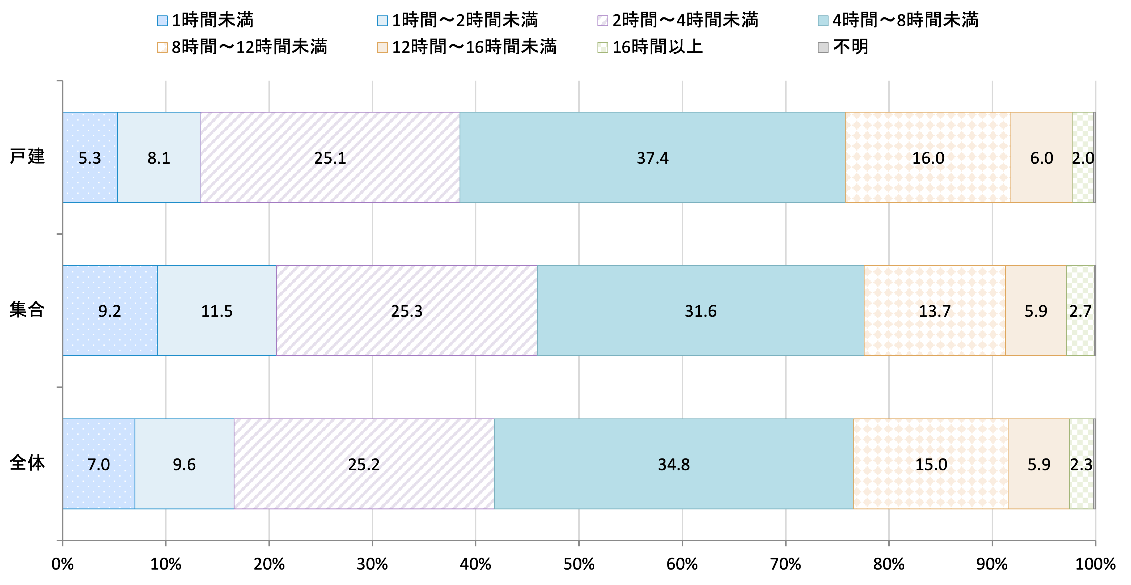 | 1時間未満 | 1時間~2時間未満 | 2時間~4時間未満 | 4時間~8時間未満 | 8時間~12時間未満 | 12時間~16時間未満 | 16時間以上 | 不明 | |