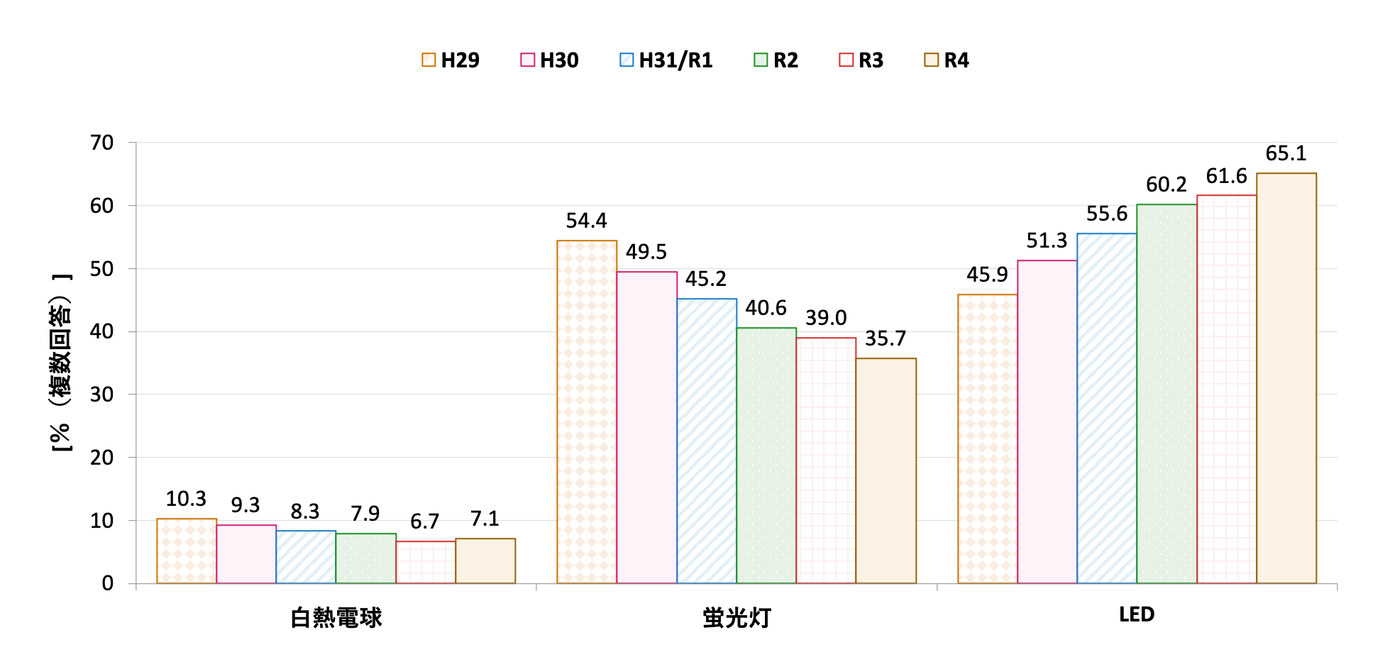 家庭におけるLED照明の使用率は上昇しています。令和4(2022)年度に、居間でLED照明を使用している世帯の割合は65.1%で、前年度より3.5ポイントの上昇、本調査を開始した平成29(2017)年度と比較して19.2ポイントの上昇となっています。