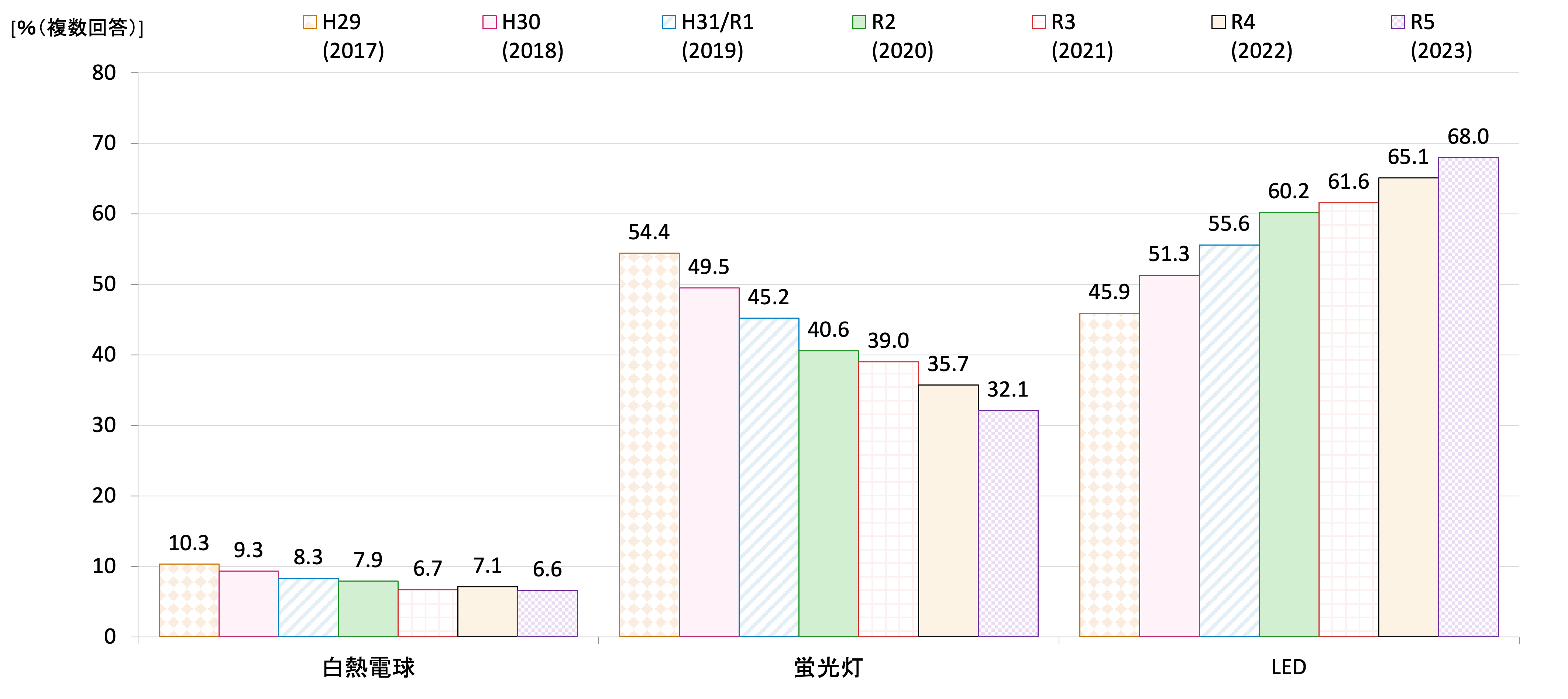 家庭におけるLED照明の使用率は上昇しています。令和5(2023)年度に、居間でLED照明を使用している世帯の割合は68.0%で、前年度より2.9ポイントの上昇、本調査を開始した平成29(2017)年度と比較して22.1ポイントの上昇となっています。