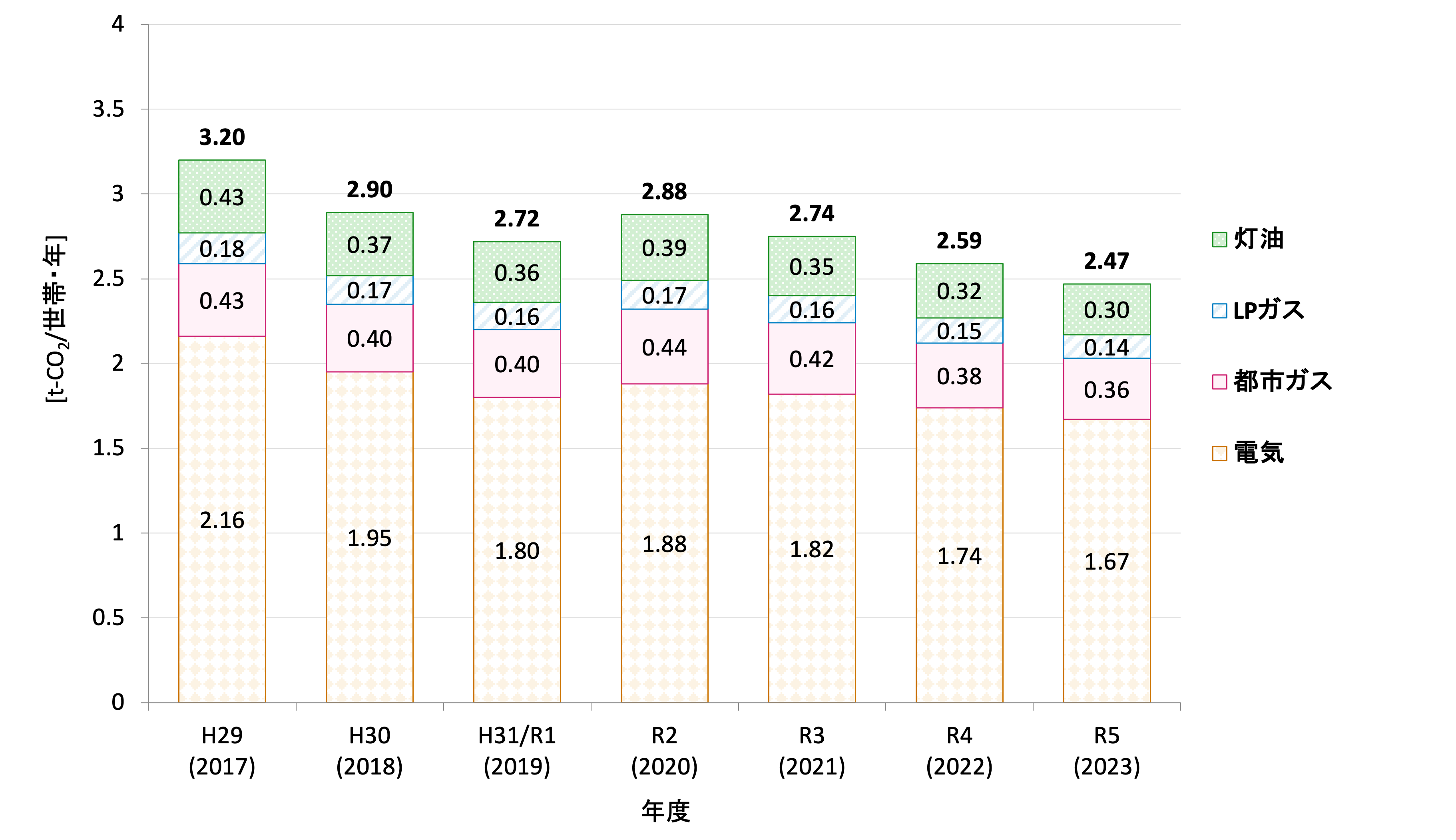 令和5(2023)年度の世帯当たり年間CO2排出量(電気・ガス・灯油の合計)は2.47トンで、本調査を開始した平成29(2017)年度に比べ約22.8%、前年度と比較して約4.6%の減少となっています。