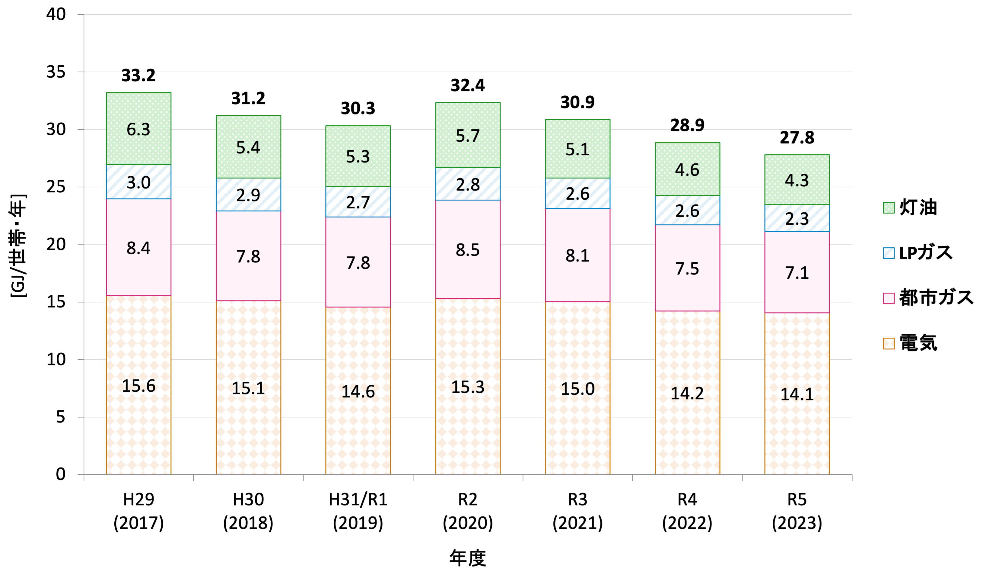 令和5(2023)年度の世帯当たりの年間エネルギー消費量(電気・ガス・灯油の合計。電気は1kWh当たり3.6MJで換算)は27.8GJ(ギガジュール)で、前年度より3.8%の減少、本調査を開始した平成29(2017)年度と比較して16.3%の減少となっています。