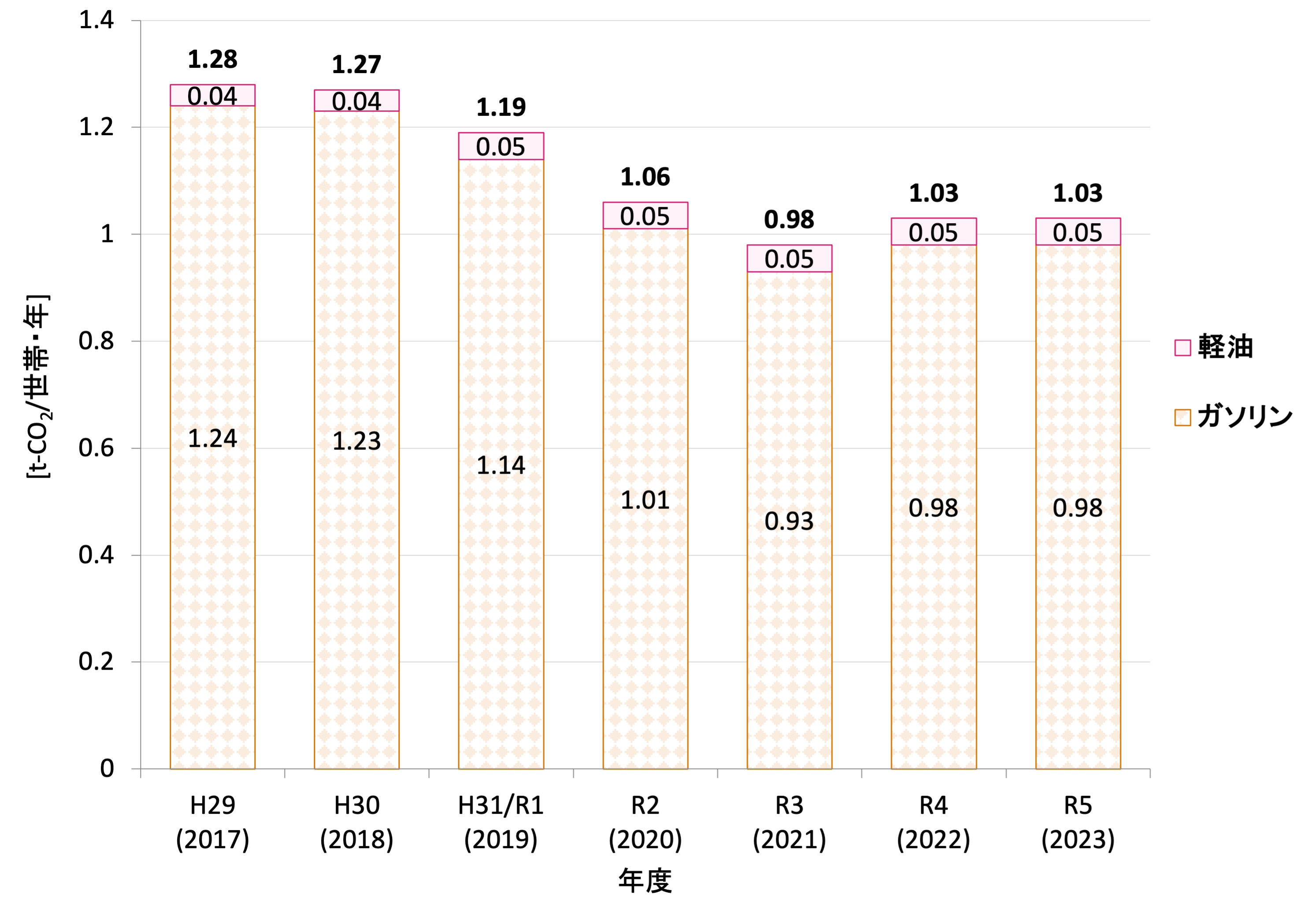 令和5(2023)年度の自動車燃料による世帯当たりの年間CO2排出量は1.03トンで、前年度と同水準となり、本調査を開始した平成29(2017)年度と比較して19.5%の減少となっています。