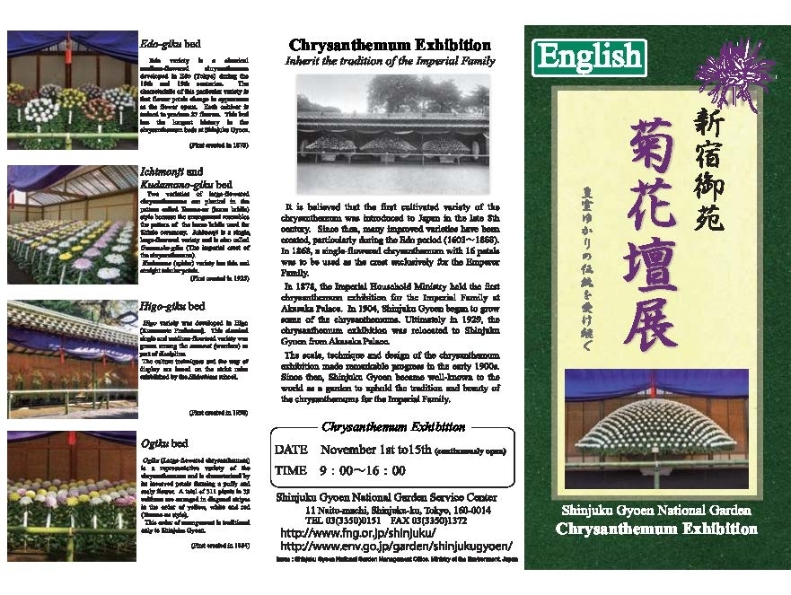 In 1878, the Imperial Household Ministry held the first chrysanthemum exhibition for the Imperial Family at Akasaka Palace. The chrysanthemum exhibition then developed into an event to which foreign envoys were also invited. In 1929, the event was relocated to Shinjuku Gyoen from Akasaka Palace. Ever since its opening to the public as a National Garden in 1949, Shinjuku Gyoen has inherited this tradition.