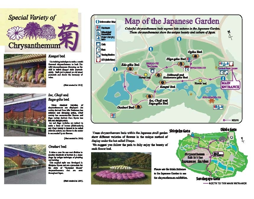 * During the Chrysanthemum Exhibition period, the Information Center (at Art Gallery on the 1st floor) located outside the Shinjuku Gate entrance is hosting “Guide of Chrysanthemum” exhibition that clearly introduces the appeal of the Shinjuku Gyoen Chrysanthemum Exhibition. Admission to this exhibition is free.
