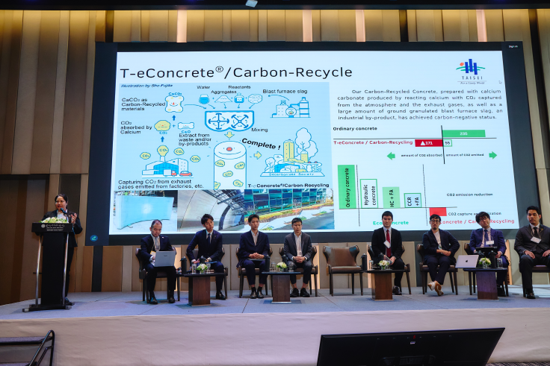 Taisei introduced its initiative to achieve “Zero Carbon Buildings” by using CCN technology to capture carbon from factory exhaust gases and reuse it as concrete materials. Construction using zero-carbon concrete has already commenced in Japan and Thailand, realizing CO₂ reduction throughout the entire building lifecycle. Additionally, the company contributes to solving agricultural waste issues and reducing PM2.5 by utilizing rye husks and biochar. Furthermore, the company supports customers' decarbonization efforts through its Carbon Neutrality Diagnostic Service, proposing a sustainable future for construction.