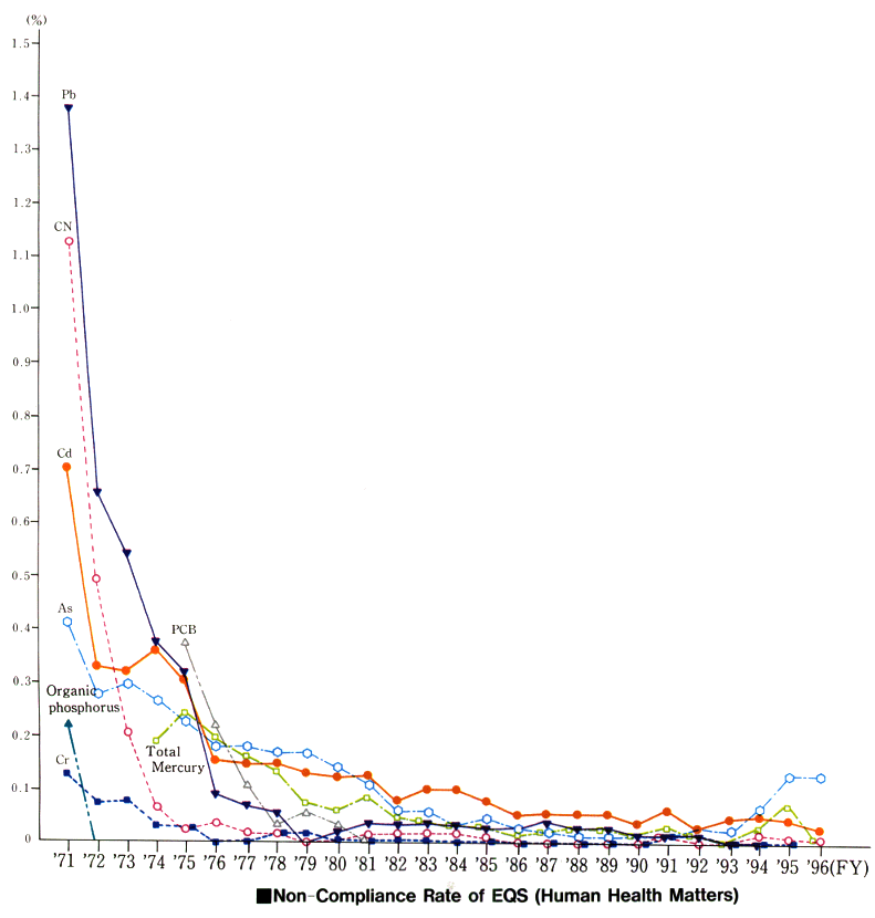 In March 1993, the Environment Agency broadened and strengthened the EQS for protecting human health. As a result. EQS for a total of twenty-three substances are now stipulated. These EQS were established with due consideration of potential health hazards associated with the intake of these substances through drinking water and/or fish and shellfish. In addition, twenty-five other items were also selected for precautionary monitoring in water environments.