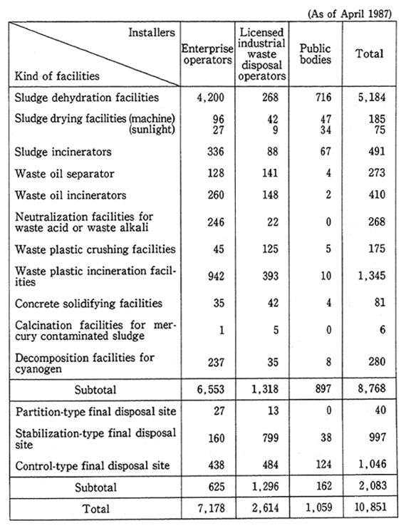 A permission system is in force for the installation of specified facilities. In 1987, 553 applications for installation and 577 applications for alteration were permitted.